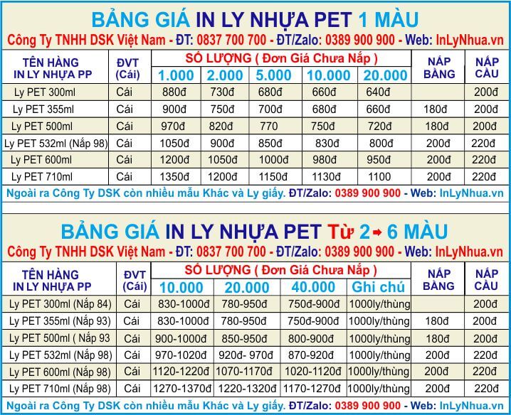 Bảng giá in ly nhựa, bảng giá in ly giấy, bảng giá ống hút, bảng giá in màng ép ly