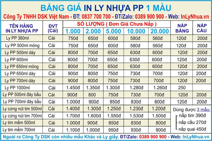 CÔNG TY IN LY NHỰA DSK CẬP NHẬT BẢNG BÁO GIÁ IN LY NHỰA PP ( 2020 ) Bảng báo giá in ly nhựa 350ml, ly nhựa 500ml, ly nhựa 600ml, ly nhựa 650ml, ly nhựa 700ml, ly nhựa 500ml đáy bầu, ly nhựa 700ml đáy bầu, Ly cứng 500ml, Ly cứng 700ml, Ly tim […]